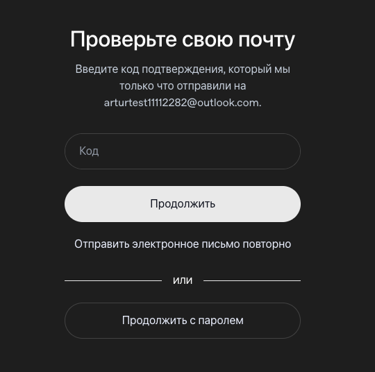 После нажатия «Продолжить» на почту придёт код подтверждения.