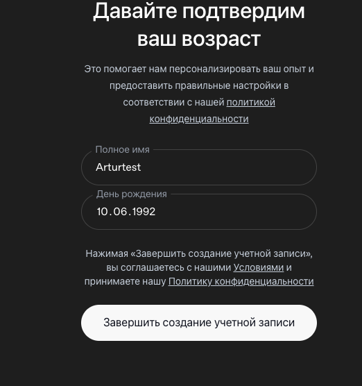 Выберите страну, укажите дату рождения, затем введите имя и фамилию.