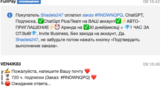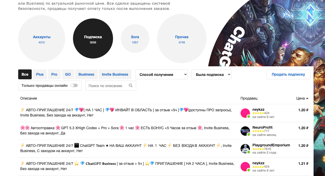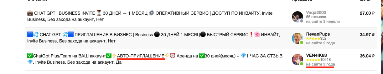 На FunPay найдите подходящий лот с приглашением в рабочую область ChatGPT на 30 дней.